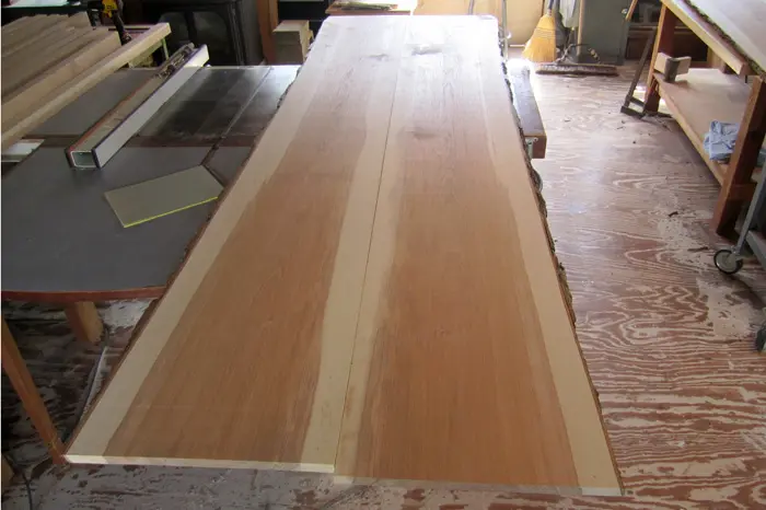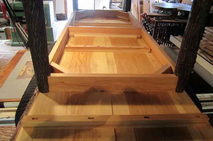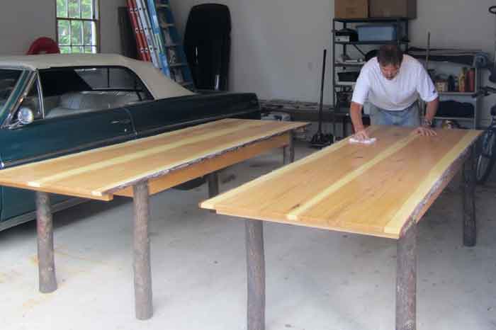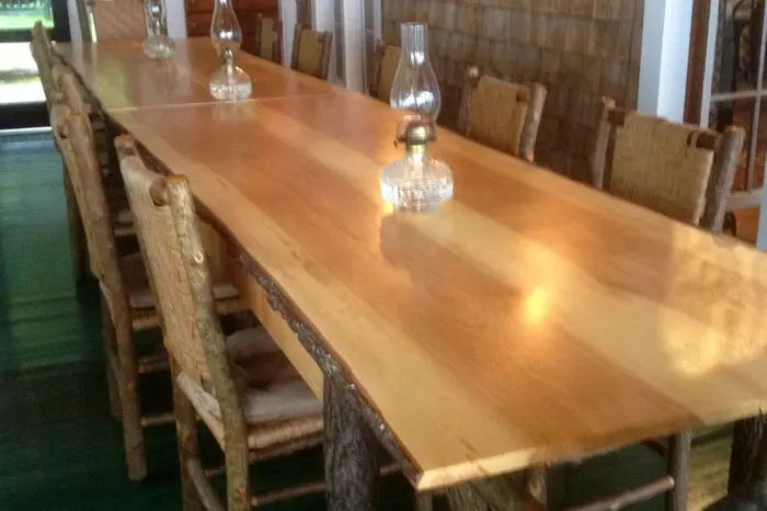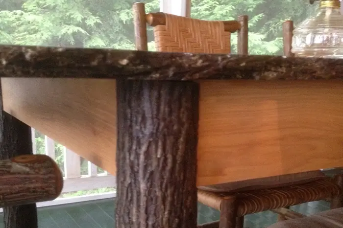 The tops of these two dining tables are made of flitch cut hickory boards with “live” edges. The hickory log was cut and milled by a local sawyer in Hopkinton. The wood was air-dried for two years before construction could begin. The legs are kiln dried, 3” diameter, hickory saplings. The client wanted a pair of “rustic” tables that could be placed end to end, and seat 12-16 people. A long overhang reinforced with slotted “strong-backs” on the ends make this possible. The tables reside on a porch in northern Maine which is why the finish is spar varnish.