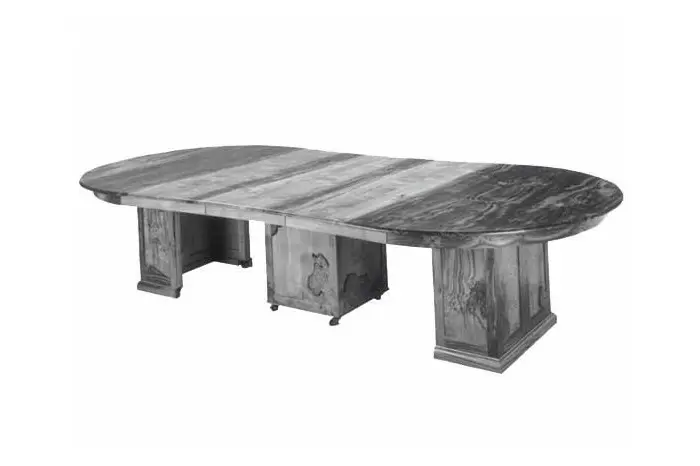 This one-of-a-kind table was commissioned by a family that wanted to seat 16 people on occasion. The box within a box design, castors, and heavy duty, ball bearing table slides, accomplish this requirement. The three active leaves are curved inward to make group seating more intimate.