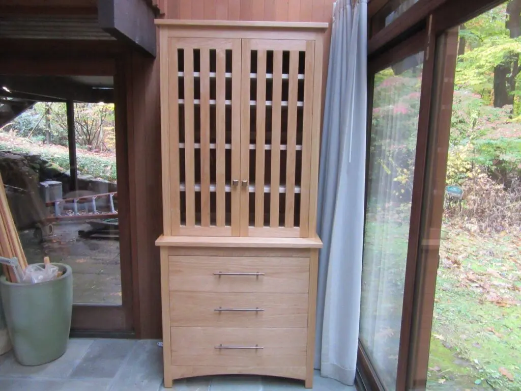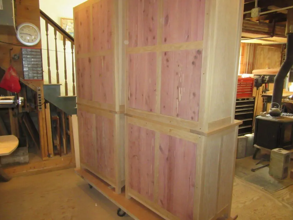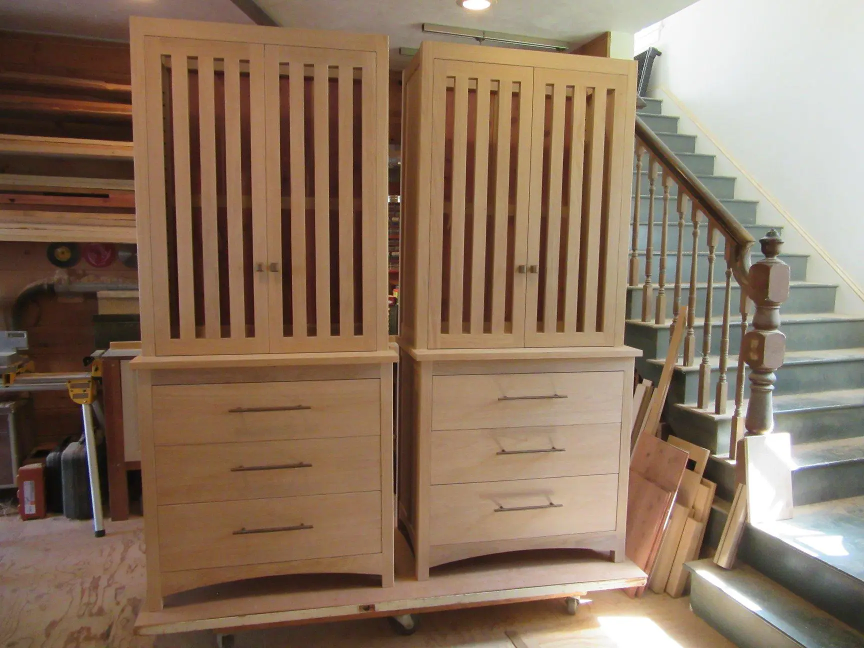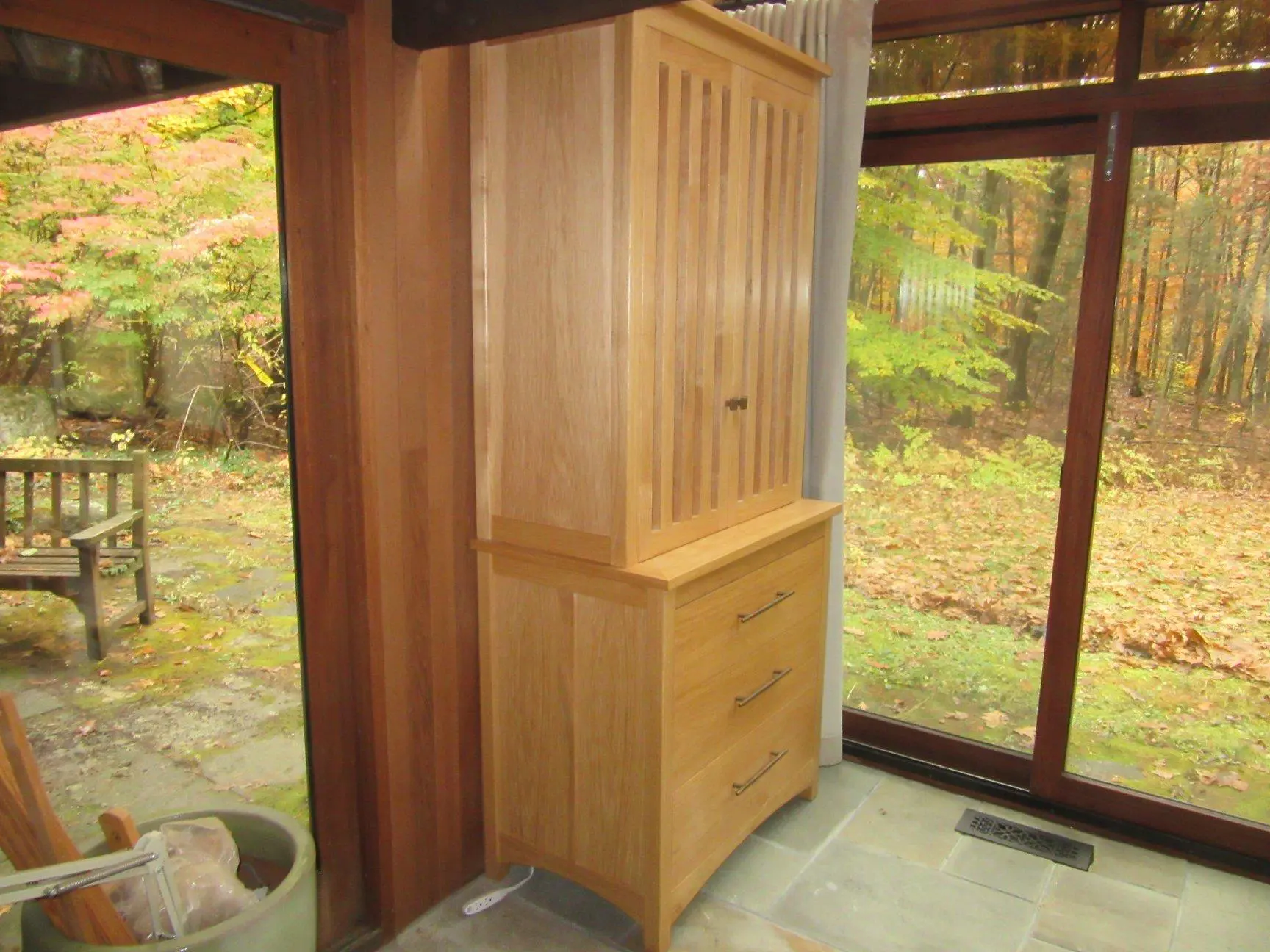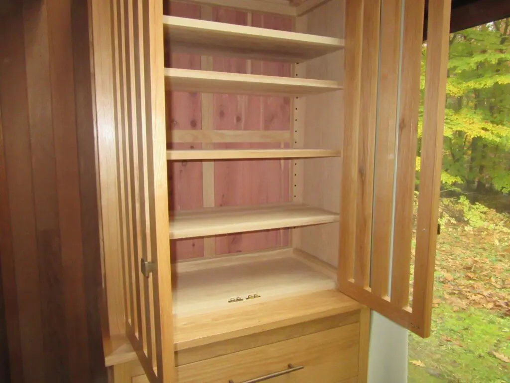 This pair of cabinets was installed on 10/29/19 at a private residence in Carlisle, MA. They face each other on opposing walls. The cabinets were designed based on a concept sketch, and outside dimensions, provided by Burchill Interiors. The solid bronze door, and drawer, pulls were provided by Burchill Interiors as well. The cabinets are made of solid hickory, sequence matched hickory veneer (side panels), and solid aromatic cedar (backs). The carcass joinery is mortise and tenon, and the outside of the cabinets are finished with clear shellac.