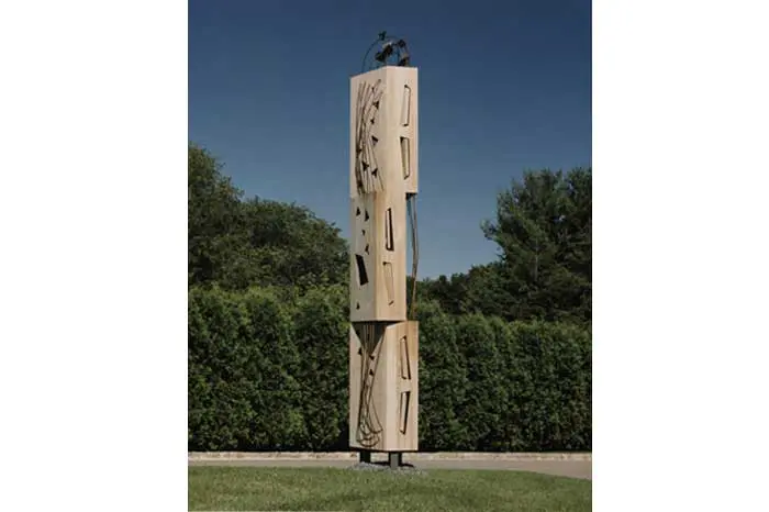 One-of-a-kind. While walking to the car after a meeting, an interior designer asked if I was interested in submitting a proposal, “Something Nevelsonesque”, for a driveway island at a private residence in Brookline, MA. The plan was accepted after a structural engineer determined the design could withstand 100 MPH winds. The teak carcass is bolted to three 4” x 12’, powder coated, aluminum I beams, which bolt to a concrete footing.
