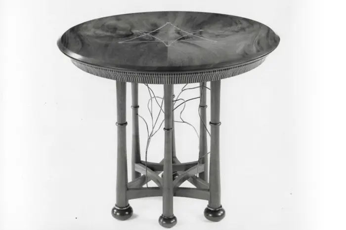 One-of-a-kind. The top is book matched mahogany with satinwood inlay, which outlines the pattern of the base. The apron is composed of individual “stack laminated” pieces.