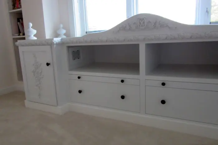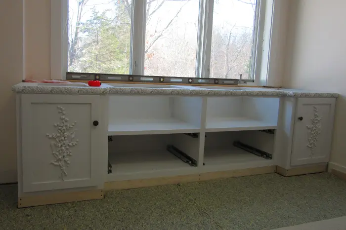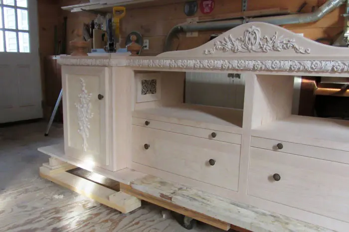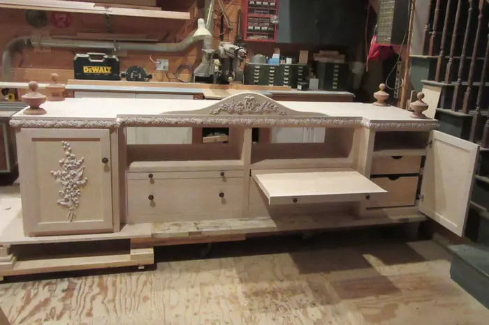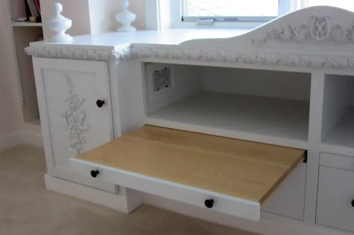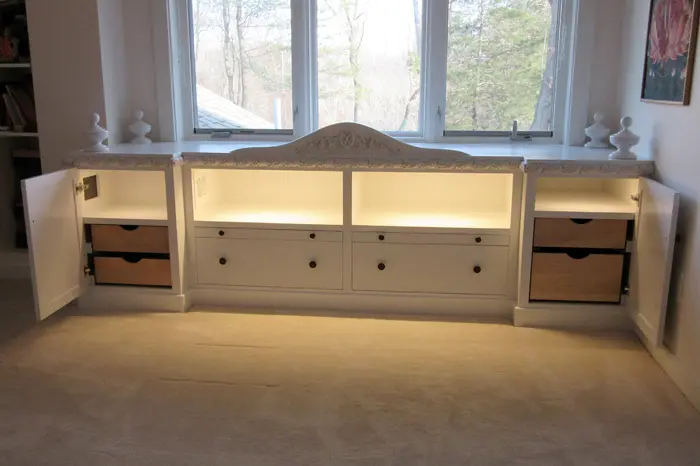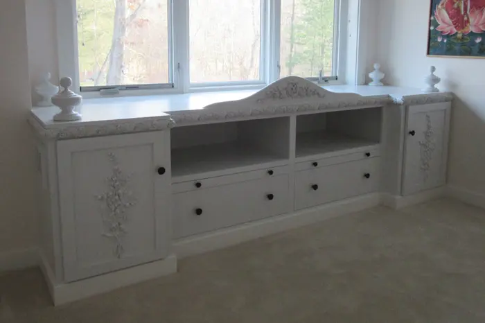 The client and I worked together closely on planning this built-in. We found the interesting appliques at a company in CA, and were pleasantly surprised when they arrived. The modular three piece design made a second floor installation relatively simple.