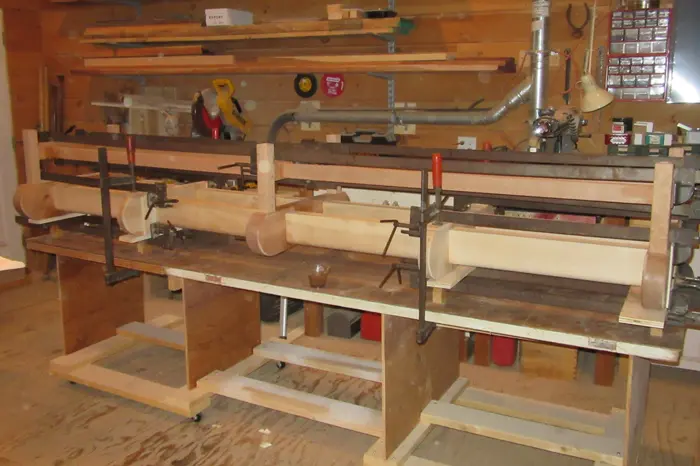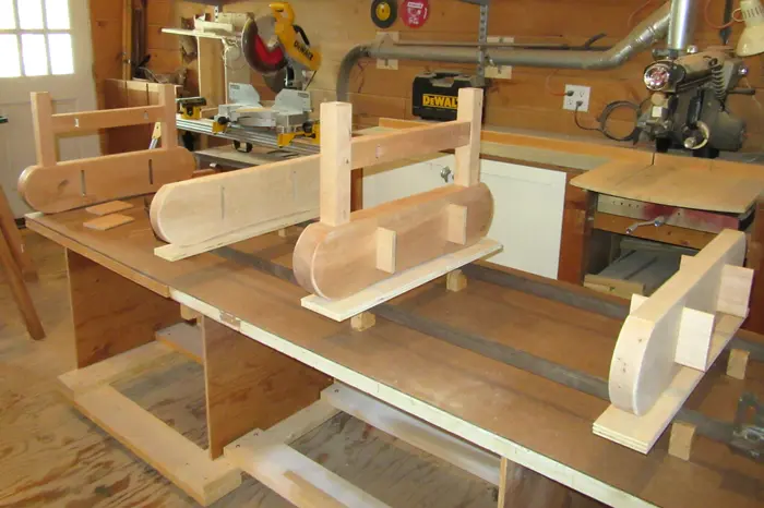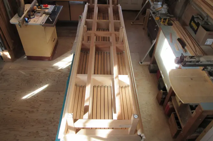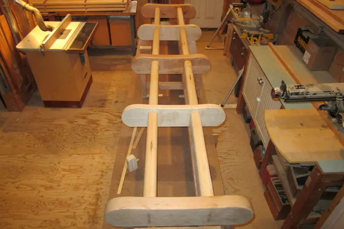 At our second meeting, I showed Kris a proposal drawing of a bench I had done in 1998, for the Newton Art Center. The proposal was rejected, but I thought the design was still viable, and offered a starting point; she agreed. I reworked the design and submitted it to the HCA. The design was approved, but Kris suggested making the bench “as long as possible”. Fortunately, there was enough Hopkinton cherry left over from the 300th bench to build this frame as well.