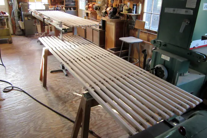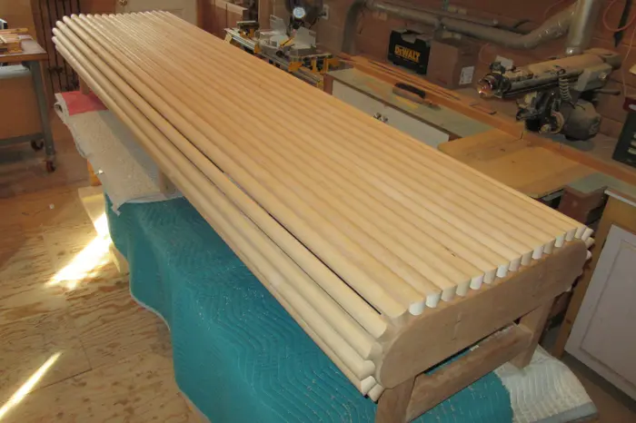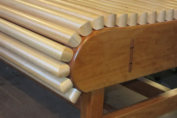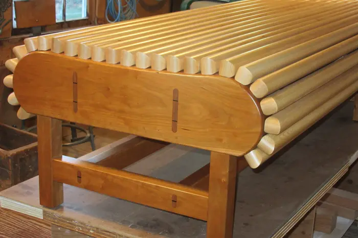 However, I soon realized that the submitted design for a slatted style seat was not going to work; the curves of the bench frame were too severe. With luck, I remembered the tamboured lid on an old roll top desk given to me by my grandfather years ago. I opened and closed the lid a few times, and watched the tambours follow the curves of the desk frame. I then made some model tambours out of poplar, but with a larger radius than the desk tambours. After several tests I knew “tambours” would work for the seat instead of slats. I contacted the HCA, and the design change was approved. The bench has 25 tambours. Each tambour has 8 fasteners, or 200 overall. Each fastener has 3 stainless steel screws, or 600 overall. Roll Top Bench was funded with a grant from Hopkinton Poly-Arts, and installed at the Hopkinton Center for the Arts on December 5, 2015.